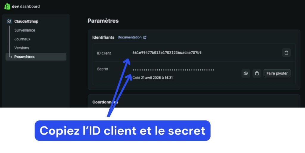 Maintenant que l’application est installée, il faut récupérer les identifiants qui vont permettre à Claude de se connecter à votre boutique.